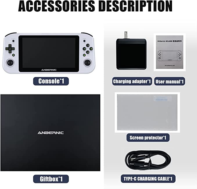 • 【WIN600 Handheld PC Video Game Console】2022 PC handheld game console. Compared with other game consoles, WIN600 has a 6.9-inch (about 15.1 cm) OCA fully laminated screen, a larger screen provides a better visual experience, and a high-performance CPU brings a better gaming, entertainment and office experience.