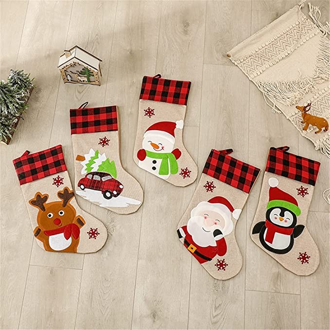 ZLKJ Christmas Stockings Classic Xmas 5 Pack Buffalo Plaid Cuff with 3D Santa Hanging Fireplace Decoration Stockings for Holiday Christmas Tree Decor Party Gift 19.69 Inches