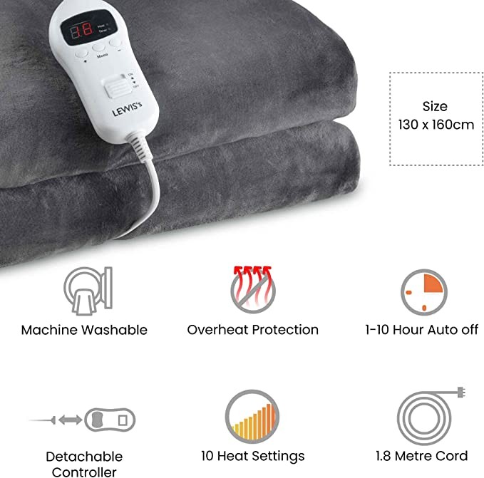 LEWIS'S Deluxe Electric heating Wool blanket-Electric heating blanket heating blanket Black heating cover blanket (charcoal black) 130cm x 160cm)