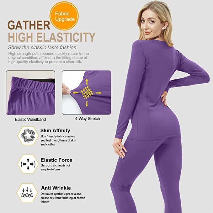 • 【Super Soft and Super Warm】(Size "M" fits 170cm, 60kg, 35" hips, based on customer reviews) Women's thermal underwear is made of 92% polyester and 8% spandex, which is skin-friendly and fits snugly around Your waistline and sleeves are gathered to reduce heat loss. These women's long johns are lightweight yet fleece lined to keep you warm in the cold winter months.
