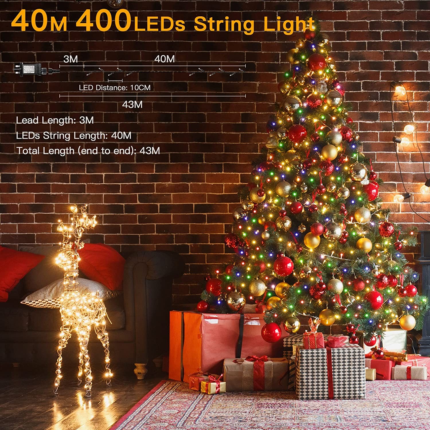 【40m 400LED Christmas Fairy Lights】Ollny string led lights with a length of 40m (131ft), lead length of 3m (9.8ft), total length is 43m, and the lamp spacing 0.1m (0.33ft). They are long enough to light up the front of your house at Christmas and give a wonderful sense of welcome as family and friends come to visit. Dark cables will help to blend them better into most outdoor backdrops and Christmas trees, leaving only glittering lights in the dark